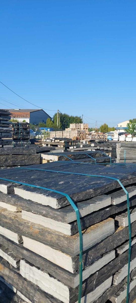 Esthétique naturelle : Les dalles de schiste apportent une touche minérale et authentique à tout aménagement extérieur. Leur texture et leur couleur varient légèrement d'une pièce à l'autre, ce qui ajoute du caractère et du charme à l’ensemble.